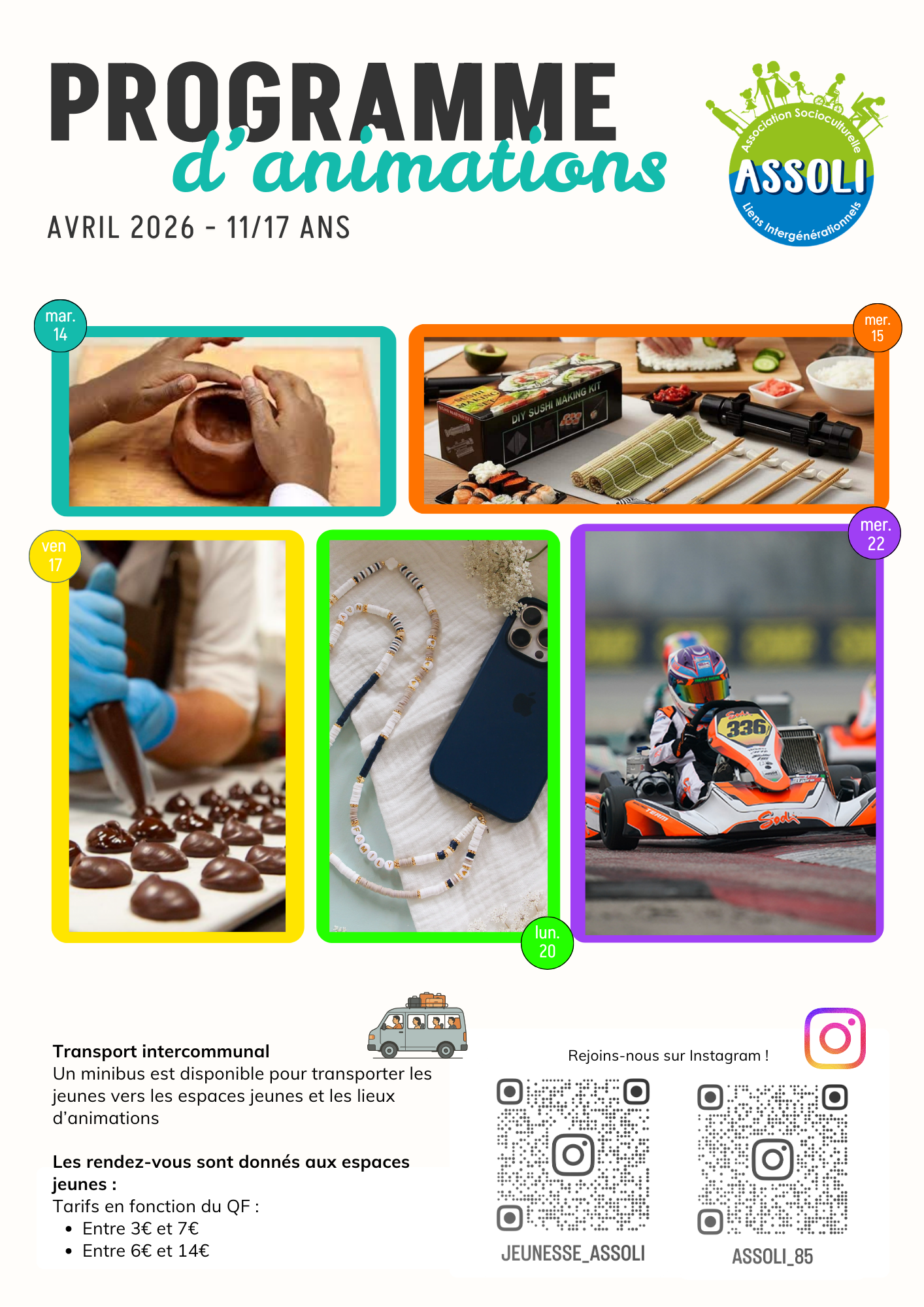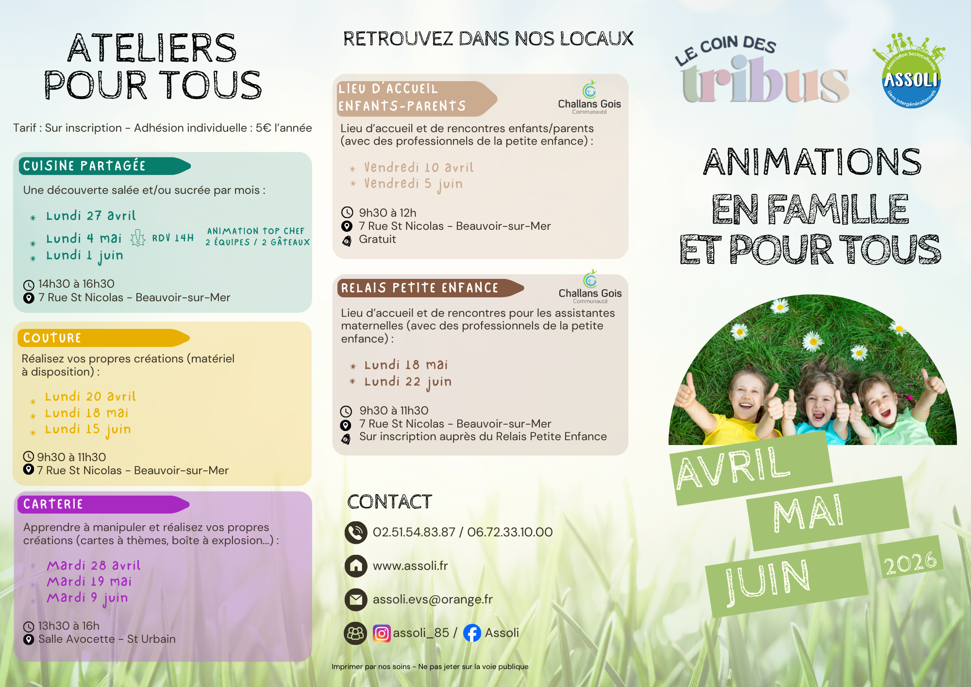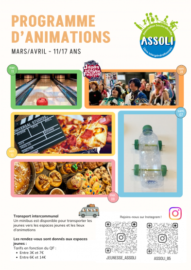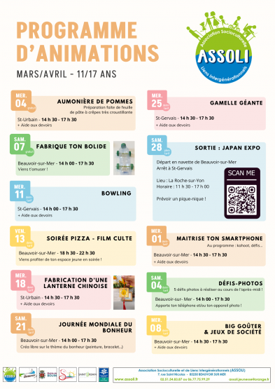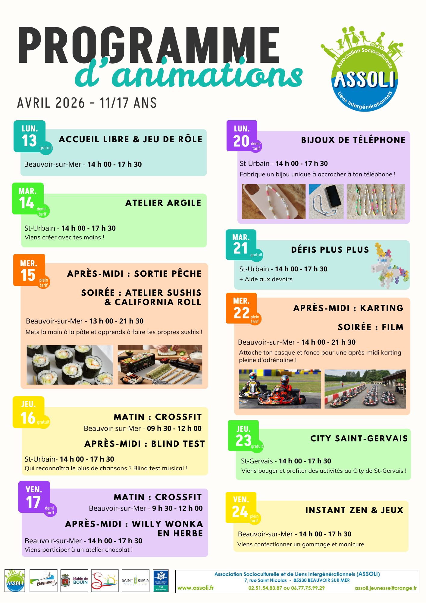 L’ASSOLI (Association Socioculturelle et de Liens Intergénérationnels) a pour objet d’offrir aux enfants, aux jeunes et aux familles, de Beauvoir sur Mer, Bouin, St Gervais et St Urbain, une place dans leurs communes au travers d’animations collectives et éducatives, de leur permettre d’exprimer leurs désirs et leurs besoins par toute démarche favorisant le lien social et les relations intergénérationnelles.